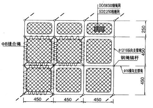 | GAR2(普通型) | 钢丝绳网 | 系统钢丝绳锚杆+支撑绳+缝合绳,孔口凹坑+张拉[或边沿(上沿)锚固(钢索锚杆2-4 m 距4.5m)+纵横向支撑绳(2-∮16)+钢丝绳网(◇08/300/4*4㎡)+缝合绳(∮8)] | 坡面加固,仰制崩塌和风化剥落、的发生,限制局部或少量落石运动范围 |