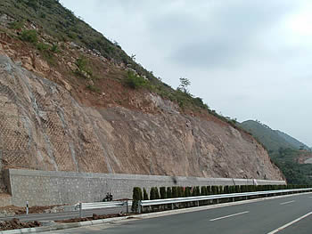 This product is widely used in the railway, highway, the mine, the water and electricity project, the tourist site, the river course and in the municipal engineering. SNS is one kind of new technical product completely changed the traditional ideas of slope protection. This product has incomparable advantages compared with other similar products. When works as products withstanding huge impulse, it can avoid the damage may caused by the partial centralism stress, with the lengthened response time; increased mesh point surface; at the same time, it receives the partial stress with the whole. The SNS product is suitable for any complex terrain, while maintaining the primitive land form. SNS product has mesh opening allowing good vision, convenient for planting trees and grasses and good for the environmental protection. It is simple for installation to save time. The product has standard components that do not need site further processing. Simple machine, less labor and a small quantity of earth and stone foundation are needed for the building block system installation quickly and easily. It does not need to excavate massively, does not need the massive material, does not disturb the neighboring buildings normal operation and other construction function, hence to avoid the heavy economic loss caused by "the disturbance".